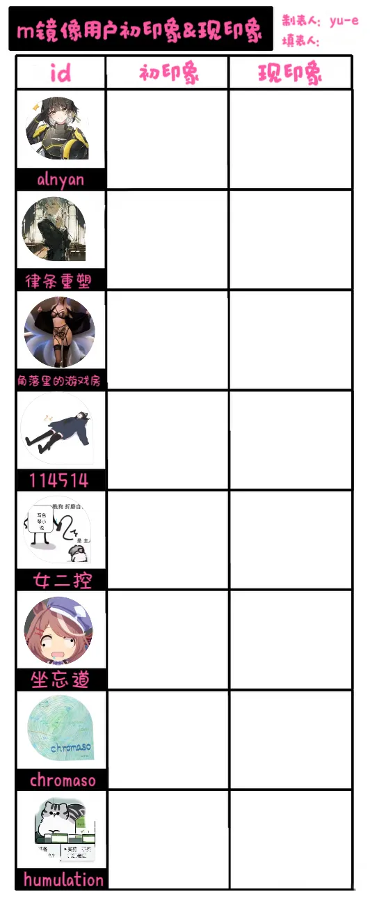yu-e:↑喂!我也是喵!Glow:↑呜哇04年的,年轻!!!!!yu-e:↑诶哟我 好可爱啊(?Glow:↑可以的可以的,头像换成这个就成!yu-e:↑唏 可以和解吗Glow:↑好的寿限无。yu-e:↑小灰灰(不是Glow:↑好难哦……啊晖,晖晖,黑化肥会挥发灰化肥会发黑()yu-e:↑还有霸道yue总形态?Glow:↑晖子,你成功引起了我的注意。yu-e:↑谁问你了(bushiGlow:↑你怎么知道我习惯左手拧瓶盖儿?yu-e:↑那也不是直接脖子右拧啊(恼)Glow:↑你自己要扭的,难道还要怪我吗?(摊手)yu-e:↑😨为什么要笑着说这么可怕的话 更可怕了啊Glow:↑我再帮你推过去一点~鸭脖也是这样拧断的,嘻嘻~yu-e:↑我不(扭头)Glow:↑求一个看看!yu-e:↑?我真求你了coukou111:↑这么说来伏地魔岂不是……yu-e:↑鼻子其实是用来按摩的(x)coukou111:↑我也这么觉得,主要鼻子坐着不舒服……yu-e:↑看到外面在讨论坐脸,其实一直没能get到比较舒服的坐法,总是硌得慌)把脸削平就可以了(我在说什么)