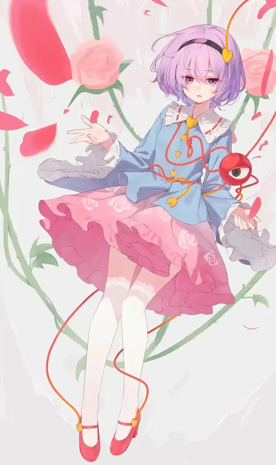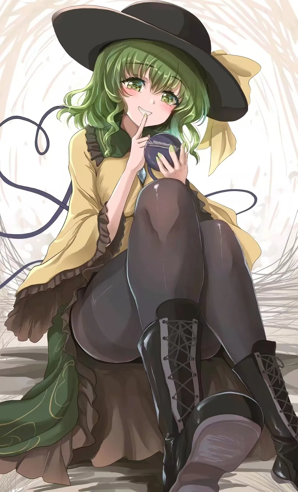 恐惧像冰冷的藤蔓一样缠绕住我的心脏,我下意识地后退了半步,却撞上了一个柔软的物体。不,不是物体,是人。我僵硬地转过头,一张毫无表情的脸庞近在咫尺。她有着一头翠绿色的短发,紧闭着眼睛,或者说,是紧闭着那只本应洞察一切的、代表着觉之能力的第三只眼。她的身上穿着一件同样是绿色的上衣,系着黄色的缎带,而我的视线不由自主地向下滑去,落在她那双被纤薄的黑色裤袜包裹得严严实实的腿上。裤袜的材质在昏暗中泛着一丝幽微的光泽,完美地勾勒出少女修长而匀称的腿部线条,一直延伸到小巧的黑色皮鞋里。