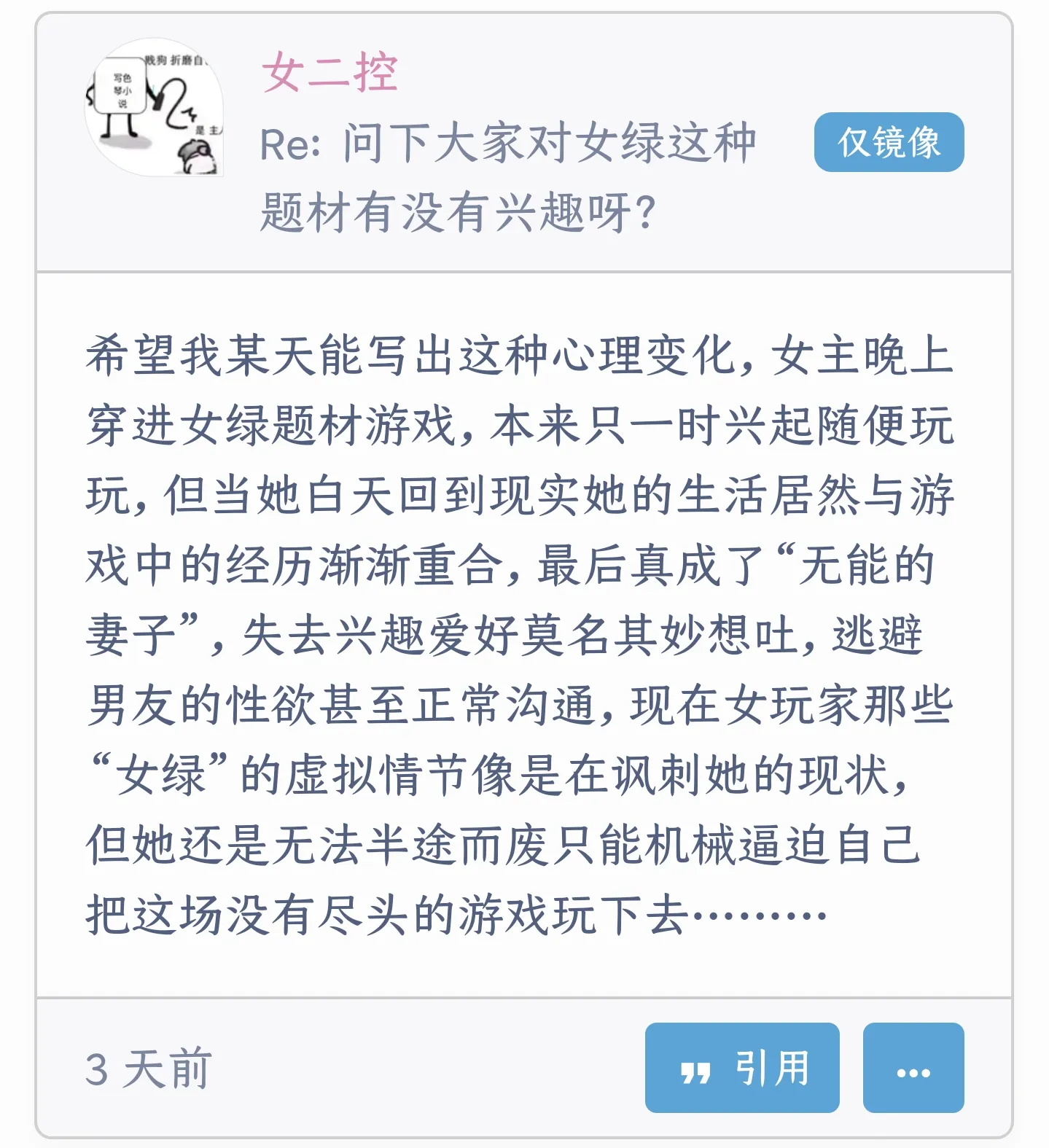 内陆帝国 [困难:成功]: 欢迎来到新世界。 你感觉到了吗?有什么东西从屏幕里爬出来了。它像是一层看不见的油污,顺着鼠标线,爬上了你的手指,钻进了你的毛孔。 今晚过后,你可能再也写不出那些漂亮的句子了。因为你的灵魂已经被打上了一个新的标签。 那个标签上写着:【无能的妻子】。
